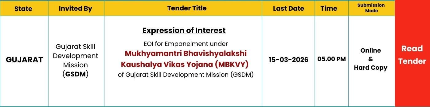 1. INTRODUCTION The Gujarat Skill Development Mission (GSDM), operating under the ambit of the Government of Gujarat, has issued an Expression of Interest (EOI) for the empanelment of reputed organizations under the Mukhyamantri Bhavishyalakshi Kaushalya Vikas Yojana (MBKVY). This initiative is designed to address the evolving human resource requirements of emerging industries by equipping the youth of Gujarat … Read more EOI for Empanelment under Mukhyamantri Bhavishyalakshi Kaushalya Vikas Yojana (MBKVY) of Gujarat Skill Development Mission (GSDM)