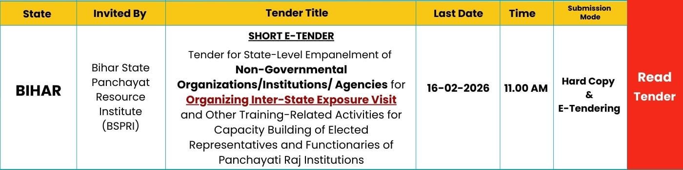 The Bihar State Panchayat Resource Institute (BSPRI), under the Panchayati Raj Department, Government of Bihar, has released an EOI for skill development training aimed at enhancing the capacity of elected representatives and functionaries of Panchayati Raj Institutions (PRIs). This skill RFP seeks to empanel qualified Non-Governmental Organizations (NGOs), institutions, and agencies to organize interstate exposure visits and training-related activities under the Rashtriya Gram Swaraj Abhiyan (RGSA) framework. This initiative aligns with the state’s commitment to decentralized governance, participatory planning, and sustainable development.