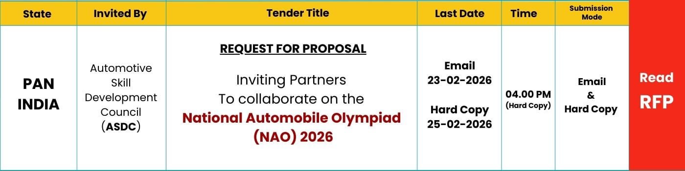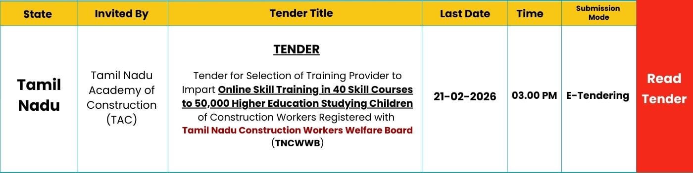 SUMMARY OF TENDER Introduction The Government of Tamil Nadu, through the Tamil Nadu Academy of Construction (TAC), has issued an Expression of Interest (EOI)/Request for Proposal (RFP) for the selection of a Training Provider to deliver online skill development training to 50,000 higher education students who are children of construction workers registered with the Tamil Nadu Construction Workers Welfare … Read more Selection of Training Provider to Impart Online Skill Training in 40 Skill Courses to 50,000 Children of Construction Workers Registered with Tamil Nadu Construction Workers Welfare Board (TNCWWB)