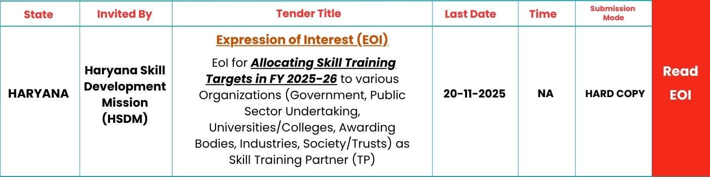 Therefore, the interested organizations may visit HSDM website: https://hsdm.org.in/https://hsdm.haryana.gov.in/Default.aspx for more details and submit their proposal to Mission Director, HSDM at Kaushal Bhavan, IP-2, Sector 3, Panchkula in sealed envelope on or before 20.11.2025.