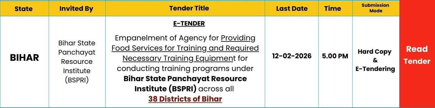 Bihar State Panchayat Resource Institute (BSPRI), under the Panchayati Raj Department, Government of Bihar, has issued an Open E-Tender Notice for the Empanelment of Agency for Providing Food Services for Training and Required Necessary Training Equipment for conducting training programs across all 38 districts of Bihar. This tender aims to enhance the capacity of Panchayati Raj Institution (PRI) members and officials through structured training initiatives aligned with the Ministry of Panchayati Raj (MOPR) guidelines. Bidders must submit proposals in both online and offline modes.