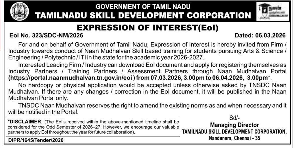 The Tamil Nadu Skill Development Corporation (TNSDC), operating under the Government of Tamil Nadu, has released this Expression of Interest (EoI) No. 323/SDC-NM/2026. This initiative is part of the flagship “Naan Mudhalvan” scheme, aimed at empowering the youth of the state. This EoI seeks to empanel leading Firms and Industries as Industry Partners, Training Partners, and Assessment Partners. The objective is to conduct high-quality, skill-based training programs for students pursuing diverse educational streams, including Arts & Science, Engineering, Polytechnic, and ITI, for the academic year 2026-2027.