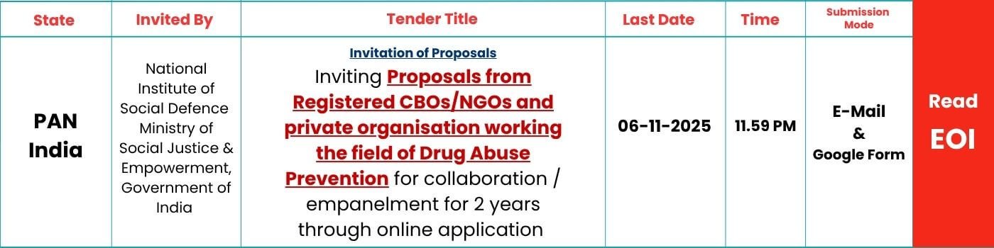 The National Institute of Social Defence (NISD), an autonomous body under the Ministry of Social Justice & Empowerment, Government of India, is inviting Expression of Interest (EOI) proposals from registered CBOs, NGOs, and private organizations. The goal is to establish collaboration and empanelment for a two-year period (FY 2025-2026) to conduct extensive training, awareness generation, and capacity-building programs in the field of Drug Abuse Prevention.