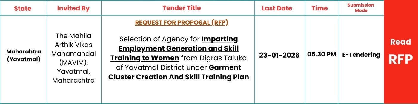 The Mahila Arthik Vikas Mahamandal (MAVIM), Yavatmal, has issued a Request for Proposal (RFP) for the selection of a skilled agency to impart employment generation and skill training to women from Digras Taluka of Yavatmal District. This initiative is part of the Garment Cluster Creation & Skill Training Plan, aimed at empowering rural women through professional garment manufacturing training and assured employment. The project aims to train 155 women, enhancing their economic and social independence.