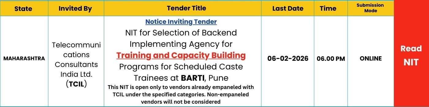 Telecommunications Consultants India Limited (TCIL) has issued a Notice Inviting Tender (NIT) for the selection of a Backend Implementing Agency to conduct Training and Capacity Building Programs for Scheduled Caste trainees at Dr. Babasaheb Ambedkar Research & Training Institute (BARTI), Pune. This EOI for Skill Development Training is limited to TCIL-empaneled vendors, including System Integrators and Start-ups, under specific categories such as IT Resources, Technical Manpower, Project Management, IT-FMS, and Skill Development and Training.