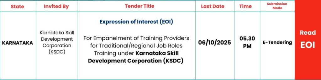 EOI for Empanelment of Training Providers for Traditional/Regional Job Roles Training under Karnataka Skill Development Corporation (KSDC)
