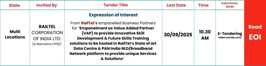 Summary of RailTel EOI for Empanelment of Skill Development & Future Skills Training Partners (VAP) EOI Number: RailTel/SR/SC/Mktg/2025-26/EOI/020Published By: RailTel …