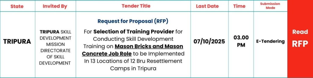Summary: RFP for Selection of Training Provider for Masonry Skill Development in Bru Resettlement Camps, Tripura Introduction The Directorate of …