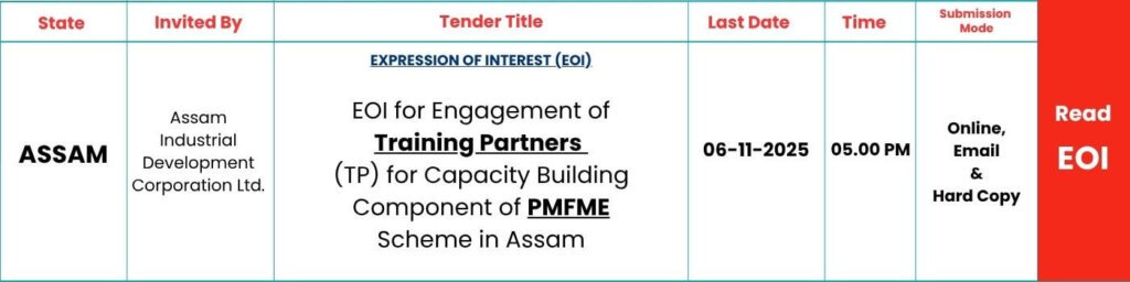 SUMMARY: Expression of Interest for Training Partners under PMFME Scheme, Assam The Assam Industrial Development Corporation Limited (AIDC), acting as …
