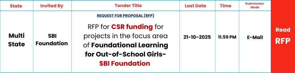 Summary of RFP 2025 – CSR Funding for Foundational Learning for Out-of-School Girls by SBI Foundation 🏛️ Introduction The SBI …